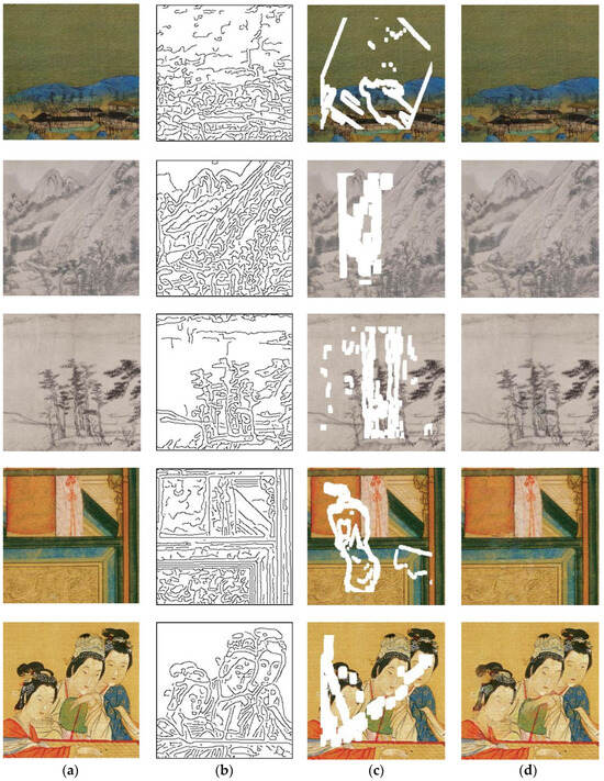 Inpainting results of the proposed model. (a) Original ancient paintings, (b) edge of ancient paintings, (c) damaged ancient paintings, and (d) inpainting results.