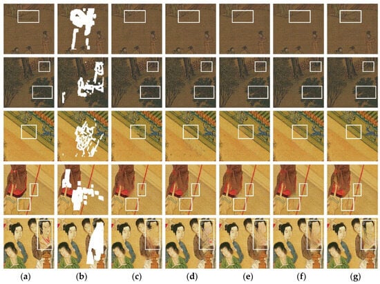 The inpainting results using the comparison models and the proposed model are presented in Figure 8. The first two images in Figure 8c display successful inpainting of most of the content and texture. However, the last three images show poor results, with large areas of missing content. Figure 8d shows improved texture structures and details over Figure 8c. However, in the third ancient painting of Figure 8d, there is noise and structural distortion in the inpainting areas. Figure 8e shows reduced texture distortion and noise compared with Figure 8d, but color deviation and missing facial contours remain. Figure 8f improves the structural distortion compared with Figure 8e. However, some minor issues still exist, such as color deviation, incomplete facial contours, and irregular blocky textures.