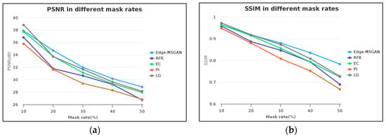 As shown in Figure 9b, the SSIM values decrease as the mask rate increases. Although the proposed model is similar to the EC model and slightly inferior to the LG model at low mask rates, its benefits become more evident as the mask rate increases. The SSIM values of the proposed model are higher than other models, particularly when the mask rate is high. This indicates that the proposed model performs better under high mask rates.
