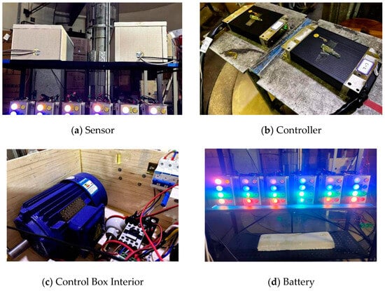 In the experimental research of this paper, the control system mainly includes relays, transformers, circuit breakers, phase-sequence protection relays, thermal overload relays, a DC contactor, and controllers. The sensing system mainly includes Hall sensors, pressure transducers, and temperature transducers. Simultaneously, experiments were conducted on five sets of devices, and the control group was established to reduce the impact of individual differences on the experimental results. The list of irradiation experiment samples in the structure of the robot’s control and sensing systems is shown in Table 1. During the experiments, the samples were placed as sets in the irradiation chamber. Five sets of device samples and four sets of lithium battery samples were labeled, and the operational status and key parameters were meticulously recorded at different irradiation total doses.
