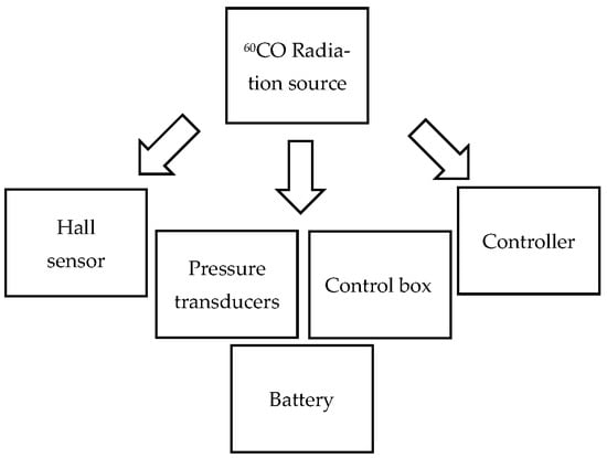 The pressure transducers typically incorporate a piezoresistive sensor, which is susceptible to failure akin to a silicon-integrated circuit. Radiation exposure can induce alterations in the lattice structure of the oxide layer material and affect the carrier density within it, consequently influencing conductance [13,18,19,20]. Correlations may exist between changes in conductance and radiation dosage, yielding predictable variations at particular radiation levels. While the illustrated temperature sensor employs a type K thermocouple, the electronic components driving it may succumb to radiation-induced failure.