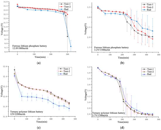 Radiation effect on lithium battery voltage diagram. (a) 12.8 V lithium iron phosphate battery voltage change; (b) 3.2 V lithium iron phosphate battery voltage change; (c) 12V ternary lithium battery voltage changes; (d) 3.7V ternary lithium battery voltage changes.