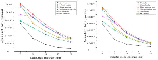 Using Pb and W as shielding materials in simulation calculations, we compared the cumulative dose of each device under Pb and W shielding materials. Figure 7, drawn using Origin, displays the relationship between the cumulative dose of electrical components inside the control box and the shielding thickness. The simulation results indicate that as the thickness of the shielding layer increases, the cumulative dose received by all components decreases significantly. From the experimental results shown above, it can be seen that the controller and transformer have the worst radiation resistance performance among the control system devices, so the shielding effect on the controller and transformer should be considered when performing shielding reinforcement.