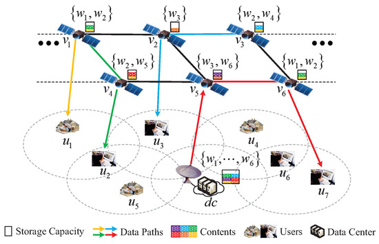 An example of a cooperative-content service in an integrated satellite–terrestrial network is shown for different users in Figure 2, where there are 7 users , 6 satellites , 6 contents , and one cloud center , the users are randomly located in the coverage of the satellites, and the access satellite for cloud center is viewed as . In the beginning, the ground station can sense the information concerning user service requirements in real-time and then make the joint strategies of cooperative caching and resource allocation based on network running states and user service requirements. All of the current contents are deployed on the cloud center, and just parts of the contents can be placed on satellites due to the limited onboard storage resources. In that case, users can retrieve the required contents from the integrated satellite–terrestrial network by the obtained joint strategies. Specifically, user can retrieve the caching content from the access satellite . As the access satellite for user can not deploy the required content , user will retrieve the content from satellite by the path . Similarly, user retrieves the required content from satellite by the path , and user retrieves the required content from cloud center by the path .