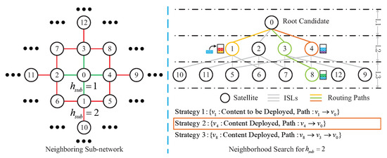 Specifically, for the content service of each user, a neighborhood search approach is used to obtain the feasible strategy of content placement and routing path by traversing both satellites and links in the neighboring sub-network. The access satellite for each user is viewed as the only root candidate in the initial layer, where the root candidate will be firstly searched to obtain a feasible strategy under multiple constraints. When the root candidate is searched, the neighboring satellites of the root candidate will be viewed as the new candidates in the next layer. Note that one satellite with the required content in the sub-network may provide the content service for the current user, then the storage resource usage for the content service of the user can be viewed as 0 according to Equation (1). Therefore, in order to obtain the feasible strategy with minimum deployment costs, whether or not a feasible strategy is obtained in the current layer, the new candidates in the next layer will continue to be searched until the current number of hops is equal to in the sub-network.