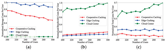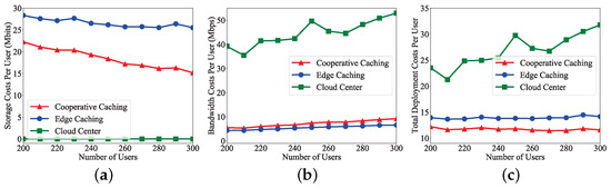 The average storage costs of each user service in the three scenarios are shown in Figure 4a. For the cloud center, all the content services of users are provided by a cloud center, and the satellite network is just responsible for data routing. Therefore, the onboard storage costs for different users are viewed as 0. For edge caching, considering that the content services of users are provided just by a satellite network with edge caching, more content services can be provided for users as the number of contents deployed on satellites increases. Furthermore, for cooperative caching, the cooperative content services of users can be provided by an integrated satellite–terrestrial network, where a cloud center on the ground can provide content services by the satellite network for users considering the restricted edge service provisioning. Therefore, the average storage costs of each user service for Edge Caching are more than that of cooperative caching. The average storage costs of each user service for cooperative caching can reduce by compared with edge caching.