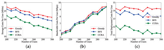 The experiments are also conducted to evaluate the performance of the proposed CCRA algorithm for the content service compared with two baselines of Greedy and BFS. For Greedy [51], the joint strategy of cooperative caching and resource allocation for the formulated problem can be obtained by searching the neighboring sub-network in a greedy way, where the searching process will be terminated until the first feasible strategy is found. However, for BFS [52], the joint strategy of cooperative caching and resource allocation is searched by BFS based on multi-priority, where all the candidates in one search layer are sorted by content caching, storage resource usage, and service delay in descending order. According to the simulation parameters in Table 2, and , , , the experiment results of each user service are provided for CCRA, Greedy, and BFS in Figure 6, including storage costs, bandwidth costs, and total deployment costs.