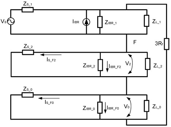 The design and functionality of inverter-based resources (IBRs) are rooted in the Voltage Source Converter (VSC) topology. Despite this foundation, adherence to grid codes necessitates their operation as constant current sources. This alignment with constant current behavior is imperative for facilitating voltage regulation and ensuring optimal controllability for system operators. Consequently, IBRs are conventionally modeled and represented as current sources within the power system framework. When analyzing a conventional power system integrated with an IBR and exposed to a ground fault characterized by impedance Rf, a comprehensive depiction is required, as illustrated in Figure 1. The power system under consideration receives its supply from an equivalent source (S) situated in a substation, caters to a designated load (L), and is interconnected with the IBR. Subscripts 0, 1, and 2 are employed to denote the zero-, positive-, and negative-sequence networks, contributing to a representation of the system dynamics. This representation enhances our comprehension of the interplay between the power system components and the IBR, particularly when confronted with challenging scenarios such as ground faults. The emphasis on these technical nuances underscores the significance of accurate modeling and representation for the effective analysis and operation of power systems incorporating IBRs.