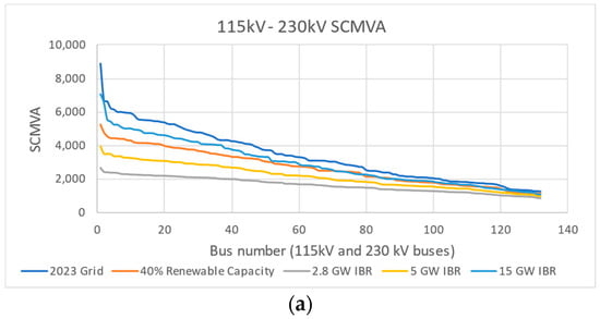 Due to the inherent characteristics of inverter-based resources (IBRs) leading to a reduced fault current contribution, there is a substantial alteration in the Short-Circuit MVA (SCMVA) capacity of the system, as depicted in Figure 2. At 38 kV, the change in the SCMVA is comparatively less pronounced, attributed to the system’s diminished strength as the reference point shifts to this lower voltage level. Notably, major generation plants directly step up to 230 kV or 115 kV. In the 115 kV–230 kV network, the base case exhibits an average SCMVA reduction of approximately 50% when compared to the fourth scenario (all Tranches 1–6 in service), representing around 5 GW of the IBRs.