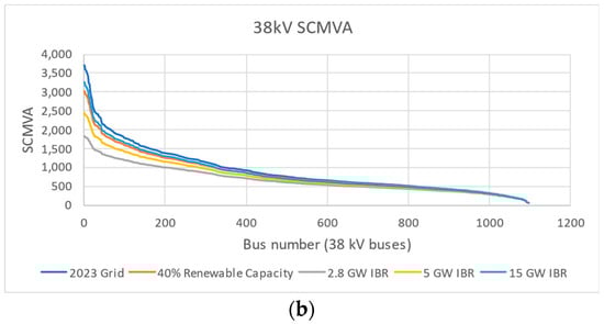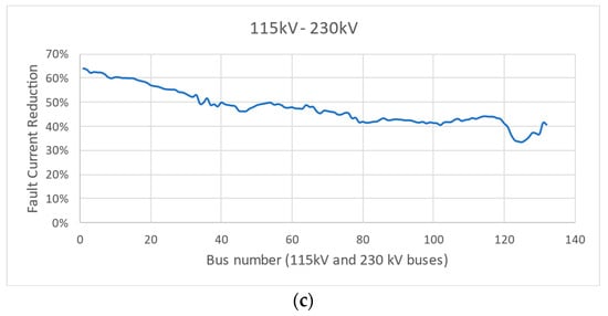 Figure 3c and Figure 4a,b present an analogous analysis of the 38 kV subtransmission system, facilitating the derivation of parallel conclusions. Specifically, buses exhibiting a greater inherent strength undergo reductions in short-circuit levels of approximately 50%, while those situated in weaker segments of the grid observe more modest reductions, around 10%.