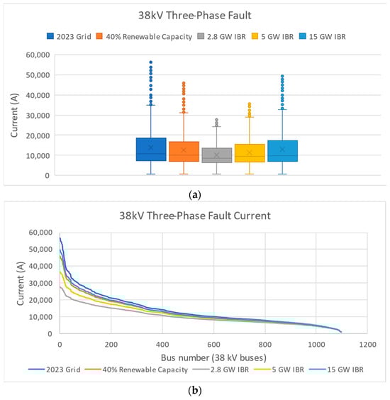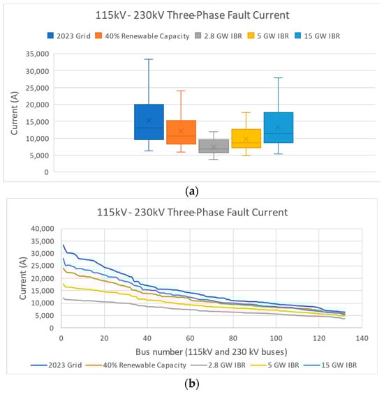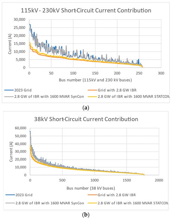 Three-phase fault current including SynCons and STATCOMs, (a) summary of 115 kV–230 kV, (b) summary of 38 kV.