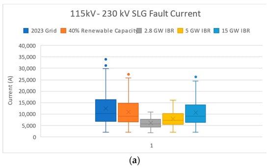 The fault current plays a pivotal role in assessing the impact of inverter-based resources (IBRs) on short-circuit capacity, thereby influencing protection systems. To gauge this impact on protection, each transmission line undergoes consecutive fault simulations, including three-phase faults, single-line-to-ground (SLG) faults, and SLG faults, with a fault resistance of 5 Ω. This examination aims to ascertain whether line protective relays can effectively detect faults in the system, especially in SLG fault scenarios, where currents might fall below the breaker’s current rating. Notably, all current transformer (CT) ratios of the 115 kV and 230 kV transmission lines have a 2000:5 transformation, while those of the 38 kV subtransmission lines have a 1200:5 transformation.