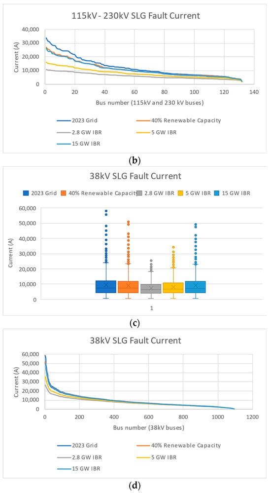 In the context of a single-phase analysis, the authors presuppose that all IBRs adhere to the specifications outlined in [15], incorporating negative-sequence injections equivalent to 50% of their positive-sequence counterparts. This assumption holds significance given that negative-sequence source impedances influence ground current injections, directly impacting the sensing of protective relaying systems. Single-line-to-ground (SLG) faults, being the predominant fault type, typically exhibit lower current contributions than three-phase faults (excluding those in close proximity to synchronous generation plants). Figure 5a,b display a parallel analysis of the results presented in the preceding subsection, focusing on the 115 kV and 230 kV transmission system. Similar conclusions can be inferred, along with the associated risks to protective relaying. Concluding the analysis, Figure 5c,d delve into the case of the 38 kV subtransmission system, as initially emphasized by the authors in [9], highlighting potentially diminished impact due to the inherently weaker nature of the subtransmission system.