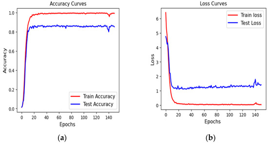 where TP, FP, TN, and FN signify the value of true positives, false positives, true negatives, and false negatives. Furthermore, K-fold cross-validation (K = 5) tests the validation of the classifier. This technique partitions the data into ‘K’ folds, and the model is trained for each fold, ensuring the efficiency of the network is not affected by the train-test split. Figure 4a,b demonstrates the accuracy and loss graphs of the model with an attention mechanism.