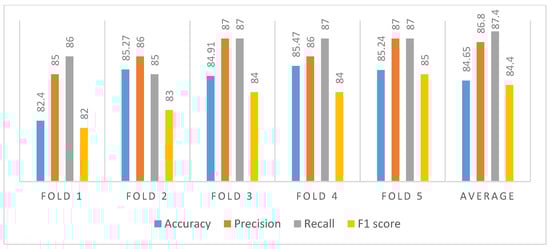 In Figure 5, the bar chart demonstrates each fold’s precision, recall F1-score, and accuracy. The highest accuracy of 85.47% is achieved for the 4th fold with precision, recall, and F1-score values of 86, 87, and 84, respectively. The average values of accuracy, precision, recall, and F1-score are 84.65%, 86.8, 87.4, and 84.4, respectively. These metrics give comprehensive details of the model’s efficiency and indicate that the model has performed relatively well, suggesting that it has made correct predictions while reducing false positives and negatives. The confusion matrix in Figure 6 illustrates the per-class accuracy of the dataset for K = 4-fold using the designed architecture.