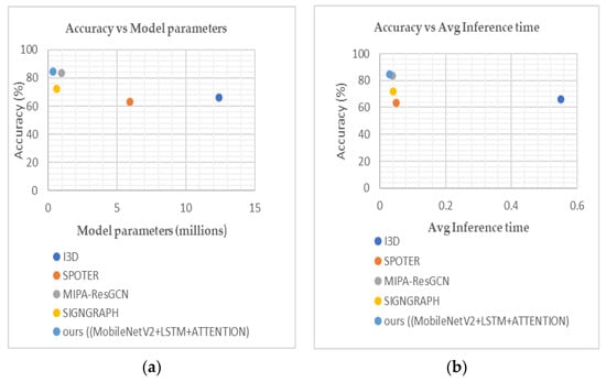 In this study, we conducted a comparison of our proposed architecture with I3D (an appearance-based method), SPOTER, (MIPA-ResGCN), and SIGNGRAPH (pose-based methods) to evaluate the computational efficiency based on the number of model parameters and average inference time taken to process each video. Our model has 0.374 million parameters, which are less than those of MIPA-ResGCN, SIGNGRAPH, I3D, and SPOTER, with 0.99 million, 0.62 million, 12.4 million, and 5.92 million model parameters, respectively. Figure 7 shows that our model is computationally efficient, with fewer parameters, less average inference time and reasonable accuracy than the other existing methods.