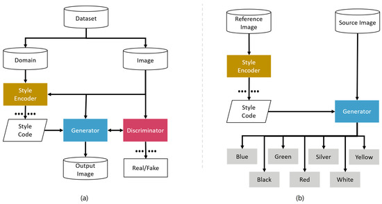 GANs have been improved by many techniques since their introduction [6]. New techniques have enhanced the quality and variety of the images generated by GANs. As a result, images generated by GANs have enhanced quality and variety. For example, VAGAN [7] can create images with poor weather conditions in their background, and CycleGAN [4] can produce artificial night-time images. Object detectors can benefit from using augmented images [8,9] for training. However, most of the previous work focused on modifying the background or the environment of the image; thus, there is no existing work on generating vehicle images with different color attributes. In this paper, we are concerned with transforming only the color attributes of vehicles in the input images while keeping the background. Figure 1 shows the general structure of the StyleGAN [10] model, while Figure 2 and Figure 3 show the architectures of CycleGAN [4] and StarGAN [5], respectively.