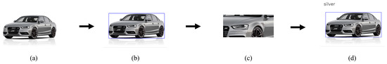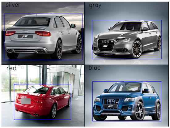 An algorithm called pixel binning is proposed in this work. It extracts vehicle color information from the selected dataset, as illustrated in Figure 6. Binning involves grouping data based on the range of the pixel values. All the individual pixel values of R, G, and B channels in an image are categorized in some bins. For the experiment presented in this work, we selected four bins of equal size—0–63, 64–127, 127–191 and 192–255—which can provide 64 different colors. However, similar color families were combined into major colors. For example, pale and bright red are categorized into the major color, red. Based on the most common vehicle colors in the CompCars dataset, we selected the following seven major colors: yellow, white, silver, red, green, black, and blue as shown in Table 2. Figure 6 illustrates the proposed algorithm, which determines where each color pixel value falls among the bins and selects the color label of each vehicle in the image among the seven colors listed in Table 2. Step (c) of Figure 6 crops only the vehicle’s body area, excluding the window regions and tire areas, to select the representative body color of the vehicle. Some of the extracted colors on CompCars are displayed in Figure 7. The distribution of colors in training and validation subsets of the CompCars dataset is provided in Table 2.