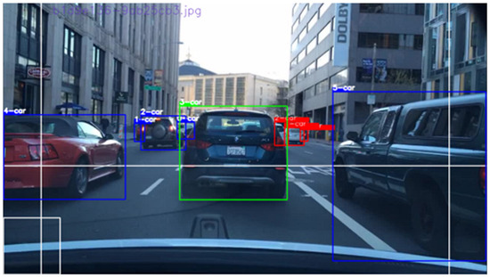 Here, indicates the width of the bounding box of vehicle , while is a specified threshold for the width. In the current experiment, we chose a of 80 pixels. indicates the intersection over union calculated between the target vehicle with respect to its neighboring vehicles . is the specified threshold for the , for which we chose in the experiment presented in this paper. We found that a small is more desirable. If we increase , the algorithm tends to select more vehicle objects that are partially occluded by other vehicles, which can degrade the accuracy. In Condition 3, and indicate the left and right edges of the bounding box, where and are specified thresholds of the right and left edges of the image, respectively. Condition 3 ensures the selection of vehicle objects showing a complete view with no clipped views. These conditions are shown in Figure 8. Our extensive experiments show that ColorGAN produces higher-quality color transitions when it is provided with vehicle images without occlusions.