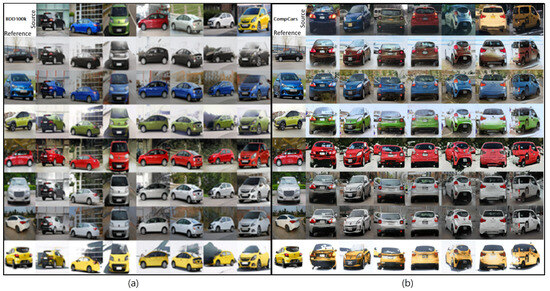 Images synthesized by ColorGAN trained using CompCars: (a) results synthesized by applying ColorGAN to BDD100k dataset; (b) results synthesized by applying ColorGAN to CompCars dataset.