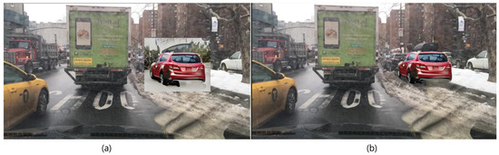 (a) Merging the augmented image without vehicle segmentation step; (b) merging the augmented image with vehicle segmentation step.