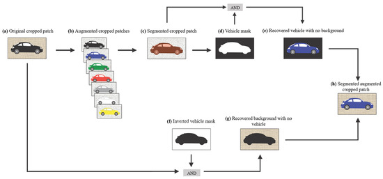 The process of background recovery for an augmented vehicle patch: (a) Original cropped patch, (b) augmented cropped patches, (c) segmented cropped patch, (d) vehicle mask, (e) segmented vehicle with its background masked out, (f) inverted vehicle mask, (g) segmented background with the vehicle masked out (h) augmented cropped patch with the original background recovered.