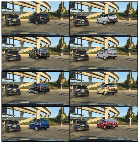 Augmentation with ColorGAN alters the background of the cropped vehicle patches. When the resulting vehicle patches are reinserted into the image, the distorted background of the vehicles creates a discontinuity in the image, as depicted in Figure 11a. To address this issue, we implement a specialized step called “background recovery” based on instance segmentation of vehicle instances. This step involves extracting the vehicle’s background patch from the original image using an instance segmentation CNN model. Subsequently, the recovered background patch is merged into the augmented vehicle patch, as illustrated in Figure 11b.