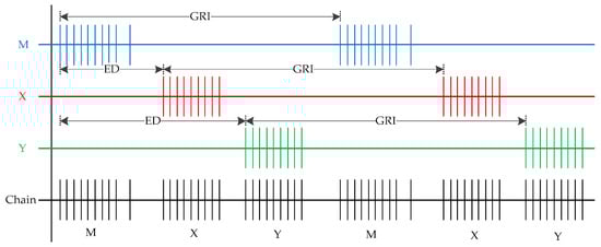 Loran-C signals are not broadcast individually but are sent in groups of pulses. Loran-C stations are divided into a master station and secondary station according to the geographical location of the design. As shown in Figure 1, the master station transmits nine pulses as a group, and the secondary station transmits eight pulses as a group. The time delay between the two pulses is 1000 µs, while the interval between the eighth and ninth pulses of the master station is 2000 µs. The ninth pulse of the master station is a symbolic pulse, which is used to distinguish the signals of the master station and the secondary station, and can also send a warning in the form of a pulse flash. Every eight or nine pulse signals transmitted by the master or secondary station are defined as a pulse group. The length of time between successive transmissions of the master’s pulse groups is termed the group repetition interval (GRI) and is expressed in microseconds. The GRI designator is the GRI divided by ten and is used as a symbol to identify and designate the Loran-C chain []. The master station and each secondary station in the chain make transmissions in a specified and precisely timed sequence. First, the master station transmits. Then, after an interval sufficient to allow the master signal to propagate throughout the coverage area, the first secondary station in the sequence transmits, and so forth. The total elapsed time from the master transmission until the secondary transmission is termed the emission delay (ED).