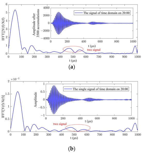 During the diurnal transition, two signals appear, as shown in Figure 5a. This phenomenon could be attributed to either the multi-path signals of the sky wave caused by multiple reflections in the ionosphere or the unstable propagation time delay in the sky wave during this time period leading to multiple signals or signal waveform distortion after linear averaging. To verify the second possibility, the signals were processed using FFT/IFFT before linear averaging, as shown in Figure 5b, which still resulted in two signals. Therefore, the multiple signals here are likely caused by multiple reflections in the ionosphere. Additionally, comparing Figure 5a,b, it can be seen that signals without linear averaging may contain cross-interference from other stations. The reflection of multi-path signals from surrounding structures, etc., for the sky wave was not considered here, as such multi-path signals are not always present.
