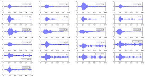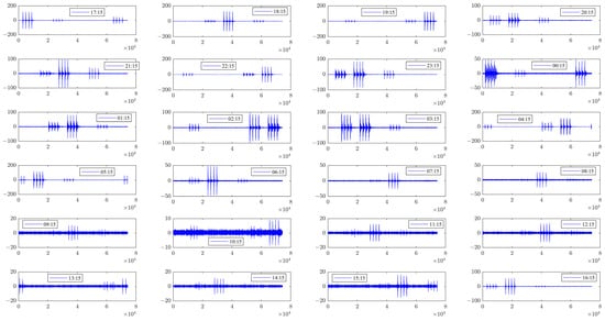 A schematic diagram of the signal acquisition process can be referred to in []. The final stored data are sampled at a rate of 1 MHz, with one file stored every five minutes. From 17:15 on 25 November to 18:00 on 26 November 2023, the Loran-C signals were collected at E and N. The time here is local time. All the data were normalized according to a uniform standard for the amplitude of the signal. Therefore, all the data in the graphs presented in this paper are the result of normalization. Part of the signal is shown in Figure 2. From Figure 2, we can see that the signal strength of each station is quite different, and the signals of each station obviously cross, so they are not easy to distinguish.