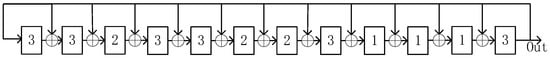 For the GPS L2C signal, its ranging code is a truncated m-sequence. The code generator consists of a 27-bit shift register that generates different pseudocodes for different satellites by configuring different initial phases. It should be noted that the output of the last bit of the code generator is fed back to both the first bit and the intermediate bits. The code generator specified in the ICD [] uses the Galois configuration (as shown in Figure 2), while most generators use the Fibonacci configuration. Each Fibonacci LFSR has an equivalent Galois LFSR that produces exactly the same output sequence [,]. The Fibonacci configuration is achieved by configuring the shift register with the correct initial phase to fix the position of the feedback taps, maintaining consistency with previous m-sequence structures.