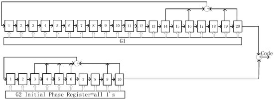 The Gold code is a modulo-2 sum generated by two N-length shift registers with distinct feedback polynomials and initial values. Notably, GPS L1C/A, GPS L5, BDS B1I, GLONASS L1OC, Galileo E5a, E5b, etc., employ the Gold code. In the case of the GPS L1C/A code generator [], it comprises two registers of identical length (as depicted in Figure 4). The feedback taps are selected from different positions within the two registers. G1 represents the modulo-2 sum of the 3rd and 10th bits, which feeds back into Register 1 with a feedback polynomial of . Similarly, G2 is the modulo-2 sum of the 2nd, 3rd, 6th, 8th, 9th, and 10th bits, also feeding back into Register 1 with a feedback polynomial of . The output sequence is obtained by performing a modulo-2 sum of the sequences stored in Registers G1 and G2.