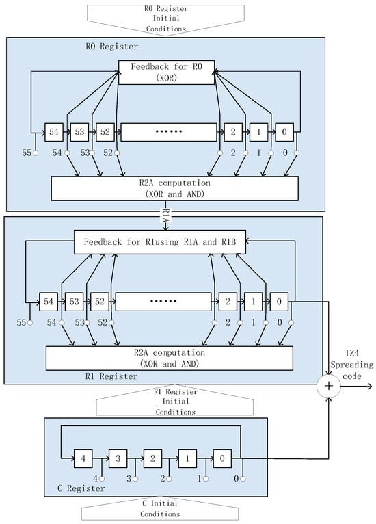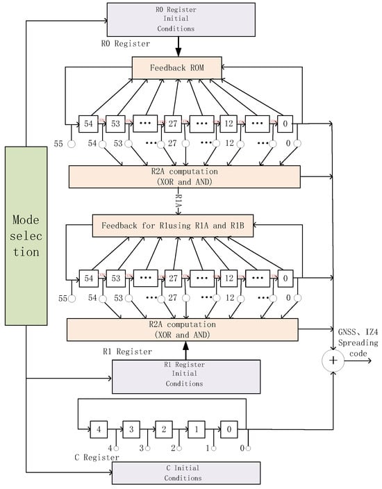 In August 2023, India publicly released the Interface Control Document (ICD) for the L1 frequency SPS space signal. As depicted in Figure 7, the code generator structure employed by India is based on the IZ4 scheme. It comprises two 55-bit shift registers, namely R0 and R1, along with a 5-bit shift register denoted as C. The initial value of the register is determined by the input PRN number. The spread spectrum code is generated using the following method [].