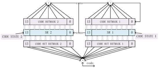 Significant global research has been conducted on the design of compatible code generators [,,,,]. The linear feedback shift register (LFSR) is widely used for generating a majority of GNSS signals. In Ref. [], a universal ranging code generator is proposed, comprising two 14-bit linear feedback shift registers (SR1 and SR2). These shift registers can be combined to form a 28-bit shift register. Additionally, this paper presents a structural scheme for the GPS L2C ranging code generator using the Fibonacci configuration. By setting different initial values to determine the feedback tap position, an m-sequence structure is achieved. In Ref. [], a memory-based approach is proposed for generating spread spectrum codes. This approach replaces the previously used dedicated logic modules and instead precomputes and stores the respective spread spectrum codes for each signal in a memory unit. When the receiver receives a signal, it retrieves the corresponding spread spectrum code from memory for processing. The exception to this memory code method is GPS L2CL, which has a code length of 767,250. As a result, the required memory size per channel increases. Each common channel necessitates a minimum of two blocks of 16 kbit RAM and a 27-bit LFSR as essential resources. Ref. [] presents the design of a spread spectrum code generator architecture that supports multi-constellation and multi-frequency signals. The code generator accommodates three types of spread spectrum codes: linear feedback shift register (LFSR)-based codes, memory codes, and Weil codes. It uses two M-long shift registers to support the generation of spread spectrum codes for satellite signals through time division multiplexing. In Ref. [], an area-efficient universal code generator based on linear feedback shift registers is proposed. It can be configured with shift registers and tap positions to generate different signal spread spectrum codes, resulting in significant savings of hardware resources. However, its support for signals is not comprehensive, as the code generator cannot handle IRNSS, QZSS L6, and other related signals. Furthermore, the four major navigation systems, namely GPS, Galileo, GLONASS, and BDS, require separate code generator structures.