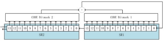 The Universal Ranging Code Generator, as presented in reference [] and depicted in Figure 8, comprises two 14-bit linear feedback shift registers, namely SR 1 and SR 2. The initial state of each shift register is stored in their respective CODE STATE 1 and CODE STATE 2 registers. The bitmasks stored in the CODE BITMASK 1 and CODE BITMASK 2 registers control the feedback switches. Similarly, the bitmasks stored in the CODE OUT BITMASK 1 and CODE OUT BITMASK 2 registers determine the output switches.