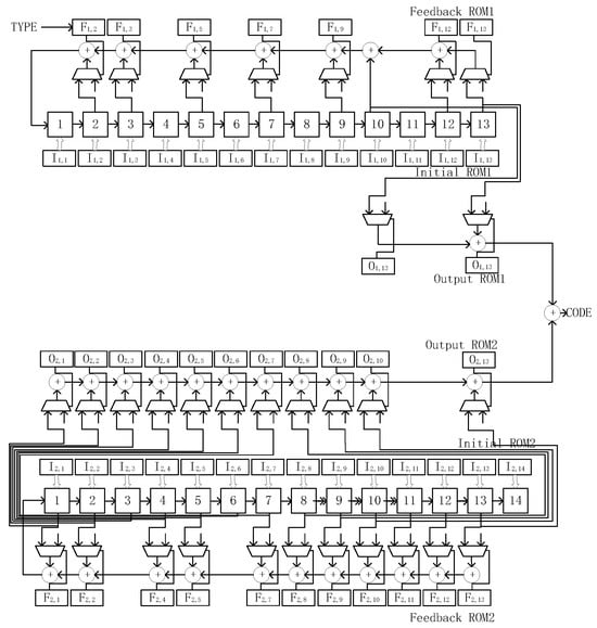 Both Kasami and Gold codes are generated as modulo-2 sums of two register sequences. The Kasami code is generated using a shift register of length N and a shift register of length , with a maximum length not exceeding [,]. The Kasami code is employed by signals such as GLONASS L1OCp, GLONASS L2OCp, GLONASS L3OC, and QZSS L6. In the case of the GLONASS L1OCp code generator [], it comprises a 12-bit shift register G1, a 6-bit shift register G2, and a feedback tap. The feedback polynomial for G1 is specified as shown in Figure 5, while the feedback polynomial for G2 is . The initial values of G1 and G2 are stored in the initial registers, and the initial value of G2 varies with the number of satellites. The modulo-2 sum of the outputs from Register 12 of Shift Register G1 and Register 6 of Shift Register G2 yields the GLONASS L1OCp spread spectrum code.