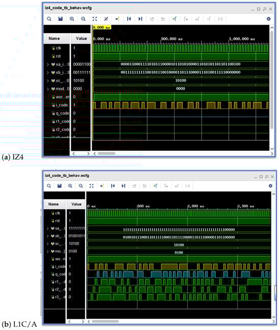 Table 3 shows the signal generation status according to the selection of the universal code generator mode designed in this paper. The generation of the spread spectrum code is performed by selecting the mode. In mode 0000, the spread spectrum code of the IZ4 data and pilot components can be generated by configuring different initial registers. In mode 0001, the first 0–12 bits of R0 and R1 are configured to generate B2a data components, while bits 13–25 are configured to generate B2a pilot components, and bits 26–38 are configured to generate B2b-I branch components. In mode 0010, bits 0–13 of R0 and R1 are configured to generate E5-I components, and bits 14–27 are configured to generate E5-Q components. In mode 0011, configuring bits 0–12 of register R0 generates the L5 XA sequence, configuring bits 0–12 of R1 generates the L5 sequence, and configuring bits 13–25 of R1 generates the L5 sequence. In mode 0100, the universal code generator simultaneously generates five GPS L1C/A spread spectrum codes (or IRNSS L5-SPS, S-SPS, SBAS L1C/A spread spectrum codes). It configures bits 0–9, 10–19, 20–29, 30–39, and 40–49 in R0 and R1 to generate five groups of L1C/A signals. In mode 0101, the generator simultaneously generates four groups of B3I signals by configuring bits 0–12, 13–25, 26–38, and 39–51 in R0 and R1. If the mode is 0110, it generates four groups of L2C signals using the Fibonacci configuration by configuring bits 0–26 and 27–53 in R0 and R1. In mode 0111, configuring bits 0–9 of R0 and R1 registers generates the secondary code of the IZ4 pilot component. In mode 1000, configuring bits 0–9 and 10–19 of R0 and R1 generates two sets of L1C/A signals, while configuring bits 20–30 of R0 and R1 generates B1I or B2I signals. In mode 1001, two sets of L1OCd and L1OCp are generated by configuring bits 0–43 of Register R0 and bits 0–31 of R1. In mode 1010, the structure of L2OCp, L3OCd, and L3OCp code generators is completely identical, generating different signal spread spectrum codes by configuring bits 0–41 in R0 and bits 0–20 in R1. In mode 1011, configuring bits 0–13 of R0 and R1 generates E5b-I components, while configuring bits 14–27 of R0 and R1 generates E5b-Q components. In mode 1100, configuring bits 0–39 in Register R0 and bits 0–19 in R1 generates a spread spectrum code for both L6D/E channels.