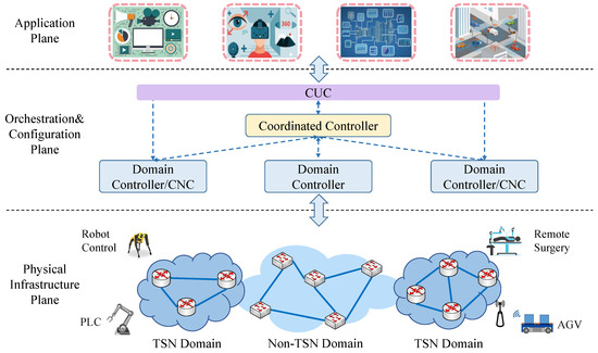 This plane is logically centralized, consisting of the domain controllers, the coordinated controller, and the Centralized User Configuration (CUC). The domain controllers control the network domains, such as the Centralized Network Configuration (CNC) for the TSN domain. The coordinated controller communicates with all domain controllers, coordinating the network control and management orders among them. CUC communicates with end stations and the application plane, being responsible for retrieving the capabilities of end stations and transferring the requirements of the application plane to domain controllers or the coordinated controller.