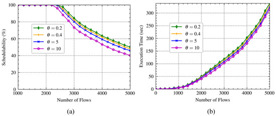 In this section, we evaluate the performance of our approach and compare it with the widely-applied SMT approach [16]. The evaluations are mainly focused on the schedulability and execution time, where schedulability is defined as the ratio between the number of scheduled flows and the number of flows to be scheduled. The simulation topology is the same as that in Figure 1. The bandwidth of the network is 1 Gbps. Each time-sensitive traffic flow transmits from a TSN domain to another TSN domain, and the non-TSN domain is composed of non-TSN capable switches. The propagation delay is set as 0.5 s, and the forwarding delay is set as 1 s. The period of the time-sensitive traffic is selected randomly from the set {1 ms, 2 ms, 4 ms, 8 ms, 16 ms, 32 ms, 64 ms}. Each time-sensitive traffic flow is required to finish its transmission in one period. The frame length is 64 bytes, and a flow contains frames, = 1, 2, 4, or 8 as in [20]. The time limit for scheduling approaches is 20 min [45]. For each flow, the value of is selected randomly with uniform distribution. These scheduling approaches were implemented in Python 3.10 on a PC with 64-bit 8-core 3.0 GHz Intel Core-i7 and 16 GB memory.
