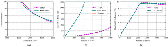Various flow numbers: A comparison of the schedulability for two scheduling approaches is shown in Figure 3a. The SMT-based approach can schedule all flows when the number of flows is less than 2200 and then decrease as the flow number increases. This is because the runtime by it reaches the time limit when scheduling about 2151 flows, i.e., no more new flows can be scheduled as the flow number increases. Our approach can maintain 100% schedulability until 2200 flows and then decrease similarly thereafter. Note that the downward trend of TMDS is slightly faster than that of the SMT-based after the flow number larger than 2200. This is due to the fact that TMDS attempts to find a feasible solution for flows one by one, which may yield suboptimal solution in terms of the whole flows. Figure 3b compares the execution time of these approaches for scheduling various flow numbers. Because all flows in a hyper-period of flow periods need to be computed according to given constraints, the SMT-based approach takes a longer time to schedule all flows. For instance, it spends approximately 1042 s to schedule 2000 flows; meanwhile, the runtime of our approach is only 3.84% of it, i.e., about 40 s. For the same reason, the SMT-based technique hits the time limit when scheduling approximately 2151 flows. The TMDS tries to search for a feasible solution through a Tabu search method-based trial rather than calculating all flows in a hyper-period according to the given constraints, which significantly reduces the execution time, e.g., it spends about 313 s when the flow number is 5000. The comparison of the bandwidth utilization for two scheduling approaches is given in Figure 3c. As expected, the bandwidth utilization increases as the flow number increases when the flow number is less than 2200. After that, the bandwidth utilization of TMDS gradually decreases as the flow increases since the schedulable flow decreases gradually. It is worth noting that the maximum bandwidth utilization is less than 10% by two approaches, which reserves sufficient resources for the transmission of BE traffic. Furthermore, the time-sensitive traffic flows are typically periodic and small according to the descriptions of flow properties in IEC/IEEE 60802 [46]; thus, their transmission typically would not block BE traffic by occupying the egress port for a long time.