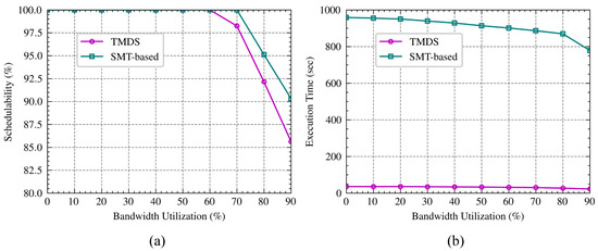Various bandwidth utilizations: To further evaluate the robustness of our approach, we design a scheduling test in various bandwidth utilizations. Specifically, we add a certain number of time-sensitive flows to the networks with different bandwidths, respectively. We choose 10 different bandwidth utilizations of the networks: 0%, 10%, 20%, 30%, 40%, 50%, 60%, 70%, 80%, 90%, 100%. The number of added flows is randomly generated between 1800 and 2000, and these flows need to be scheduled by two scheduling approaches. Figure 4a compares the schedulability of two approaches under different network bandwidths. It shows that both scheduling approaches can schedule all flows when the remaining resources are sufficient. For instance, the TMDS and the SMT-based approach can maintain 100% schedulability before the bandwidth utilization less than 60% and 70%, respectively. Furthermore, the schedulability by TMDS is slightly lower than the SDM-based after the bandwidth utilization greater 60%. This is because the TMDS following a heuristic strategy may miss some feasible solutions, making it more sensitive to the remaining resources. The comparison of execution time for scheduling approaches is shown in Figure 4b. The TMDS only takes an average of 32 s to schedule these flows while the SMT-based approach spends around 907 s for scheduling. Overall, the TMDS drastically reduces execution time while ensuring that schedulability is not degraded.