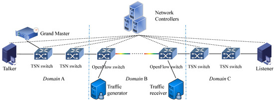 - Guo, M.; Shou, G.; Xue, J.; Hu, Y.; Liu, Y.; Guo, Z. Cross-domain Interconnection with Time Synchronization in Software-defined Time-Sensitive Networks. In Proceedings of the Asia Communications and Photonics Conference, Beijing, China, 24–27 October 2020; Optica Publishing Group: Washington, DC, USA, 2020. [Google Scholar]