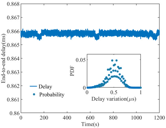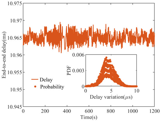 End-to-end delay and PDF delay variation in Case 2, in which twenty-six OpenFlow switches (Centec, Suzhou, China) are linearly connected over fiber in domain B. The distance between every two switches is 80 km; thus, the distance through the non-TSN domain is equal to 80 × 25 = 2000 km.