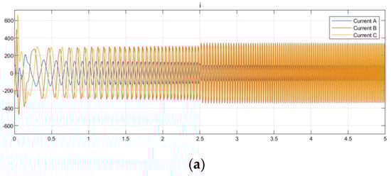 Due to the limitations that existed in the experimental environment, we only conducted tests under blocked conditions on the horizontal platform and obtained the following current results. The experimental results of the stator current before and after the utilization of the MAC and PR controller are shown in Figure 16.