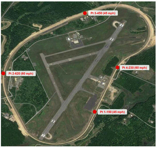 The Federal Highway Administration (FHWA) conducted numerous field tests in partnership with the Volpe Center to collect real-world data. In [34], the researcher aimed at leveraging the data for demonstrating a platooning concept utilizing CACC and adaptive cruise control (ACC). The field tests were carried out at the Aberdeen Center in Maryland on a 4.5-mile track. The track is intended to imitate the geometry of a standard US highway. It was designed with geo-locations which are called waypoints to send signals, e.g., target speeds to the testing vehicles. A platoon of five Cadillac SRX, including leading vehicles (LVs) and following vehicles (FVs), is installed with CACC controllers and tested for various configurations. Once the waypoints send the signal to LVs, LVs utilized this information along with GPS data to fine-tune their CACC settings. The fleet will navigate from the first waypoint to the last to be counted as one complete test run. Figure 1 illustrates the layout of the test track and identifies the waypoints used during the platooning testing [34]. According to the study in [35], the speed and acceleration data are pre-processed. For example, speed profiles are smoothed with the moving average technique, while acceleration data are derived from the smoothed speed data, which effectively minimized discrepancies between acceleration values calculated from raw versus smoothed speed data.