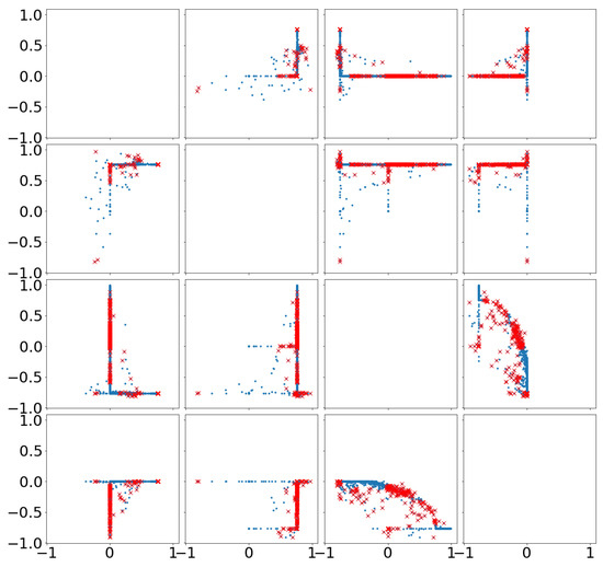 Figure 5 illustrates the normal CAV trajectories (blue dots) and falsified CAV trajectories (red cross marks) in terms of each combination of two features out of a total of four features (four rows and four columns).