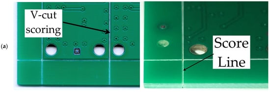 A PCB panel is a PCB board that is connected in the form of an array. PCBs are used to increase the efficiency of the assembly process of electronic components. In addition, panelization is used to standardize the dimensions to the standard of the machines (especially when the component boards have an irregular shape) []. PCBs are connected in panels in the most common ways. One of them is the so-called V-scoring method. This connection involves the creation of two parallel and straight V-shaped grooves that separate the individual PCBs. In these grooves, about a third of the material is removed from each side, leaving a thin piece of material. This connection is strong enough to hold the panel together and at the same time easy to cut off. This connection is used only for rectangular or square tiles. The second type of connection is the so-called tab-routing method. It is created during the milling of the material around the insert. However, a fragment of the materials that connect the tiles to each other is left behind. Additional mouse-bites are made in these joints for easier disassembly. This joining is usually used for tiles with a non-standard shape and those that have curves in their outline. Both connections are shown in Figure 2.