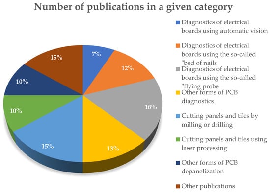 During the first phase of the search, 291 publications were obtained, focusing mainly on scientific articles and conference proceedings. This number included articles describing processes related not only to PCB panel diagnostics or depanelization, but also those that discussed PCB manufacturing and recycling processes. For this reason, an additional selection of materials has been carried out using the keywords described in the second chapter of this article. The final number of publications is 42. See Figure 5 below, in which the quantitative values of each of the categories presented in the previous chapter are shown.
