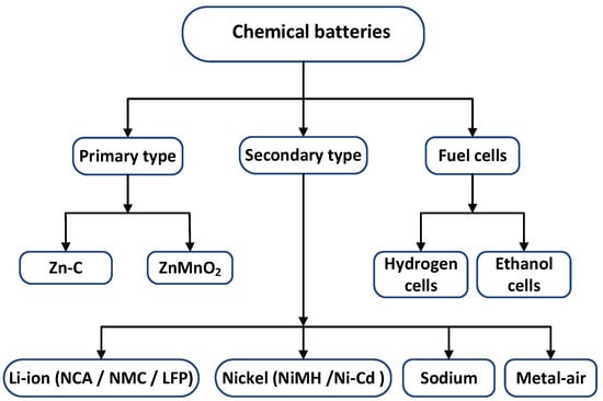 Stacks of cells that transform chemical energy into electrical energy make up batteries. Different chemistries based on parallel and series cell connections are used to meet the desired properties of a BESS. Much study and investment are being made in this area at the moment [27]. There is a big variety of batteries used for ESSs, but Figure 1 depicts the primary battery chemistries utilized in BESSs.