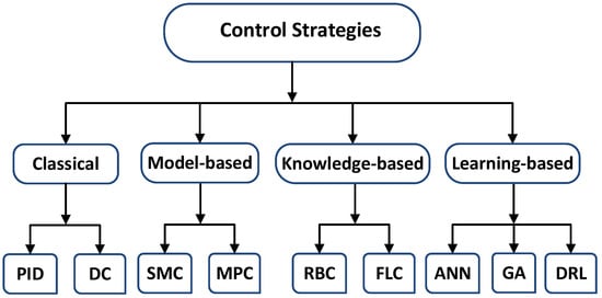 Generally, classifying the control strategies is not straightforward, being in most cases arbitrary because some controllers may exhibit characteristics of multiple groups, as they often incorporate a combination of techniques to achieve specific control objectives. However, the different control strategies can be classified into four broad groups based on their characteristics and underlying principles [44]: